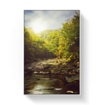 Landscape painting of a river in Vermont. The scene is set at the end of summer, following the curve of the river as it winds around a bend and disappears behind dense foliage and exposed riverbed rocks. Sunlight filters through the trees overhead, illuminating sections of the water and emphasizing the river’s path through the landscape. This is an original painting by Vermont artist John Stoyles.