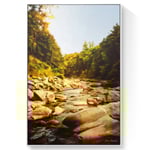 Morning River Sunris is an original Vermont river painting that captures the soft beauty of an early summer sunrise. Painted in warm tones of sandy browns, bronzes, and scattered greens, the scene looks downstream as the river flows gently between sunlit rocks and toward the glowing horizon. Once hidden beneath the river’s full spring rush, the exposed stones now rest quietly after the long, hot summer. Along the banks, tall trees and branches frame the water’s calm reflection, their leaves touched with morning light. The river no longer carries urgency, but instead moves with a steady grace. This Vermont landscape painting invites viewers to pause, breathe, and follow their own journey, just as the river continues its timeless flow.