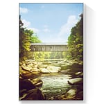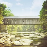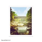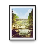 This is an original landscape painting of the covered bridge at Downers in Weathersfield Vermont. The covered bridge spans the Black River which flows from Plymouth, through Ludlow, Cavendish and Proctorsville to this viewpoint. The painting is seen from the center of the river in early Autumn when the leaves are just starting to turn. We are looking down stream towards Springfield where the river joins with the mighty Connecticut River.